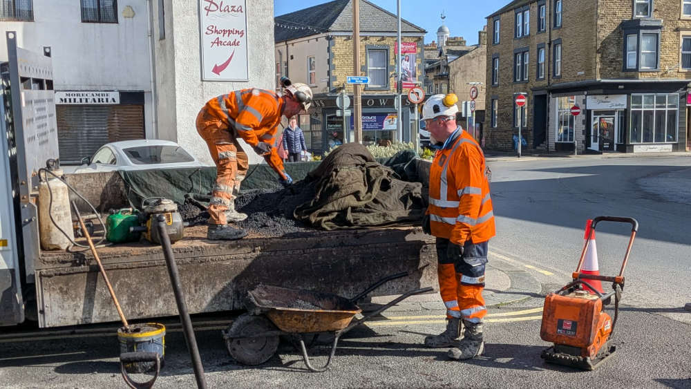 Below, a team from Multevo carrying out road repairs on Pedder Street in Morecambe on Wednesday. Photo: Beyond Radio